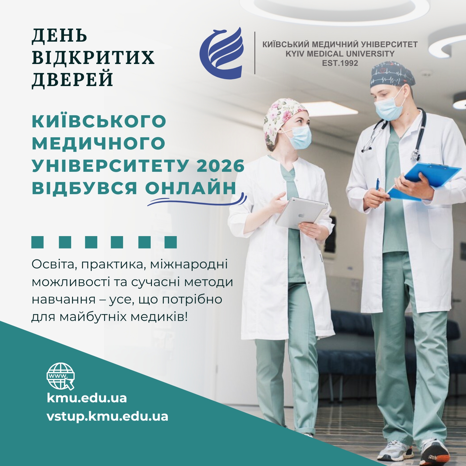 День відкритих дверей Київського медичного університету 2026 відбувся онлайн: освіта, практика та міжнародні можливості23 січня 2026 року Київський медичний університет провів перший у новому році День відкритих дверей, який відбувся в онлайн-форматі. Такий формат дозволив долучитися до події абітурієнтам, їхнім батькам та всім зацікавленим у медичній освіті з різних регіонів України та з-за кордону, а також зберегти головну цінність заходу – живе спілкування з керівництвом університету та викладачами. З вітальним словом до учасників звернувся ректор Київського медичного університету Борис Борисович Івнєв. Він привітав абітурієнтів і їхні родини з початком нового року, побажав миру та здоров’я, а також висловив щиру подяку захисникам і захисницям України, завдяки яким університет має змогу працювати, розвиватися та планувати майбутнє. Окремо було підкреслено стратегічний курс Київського медичного університету — інтеграцію в європейський освітній простір, зокрема через розвиток KMU POLISH CAMPUS у Польщі, який уже понад три роки є потужним освітнім хабом для українських та іноземних студентів. Під час заходу було озвучено ключові події та досягнення КМУ за останній період: