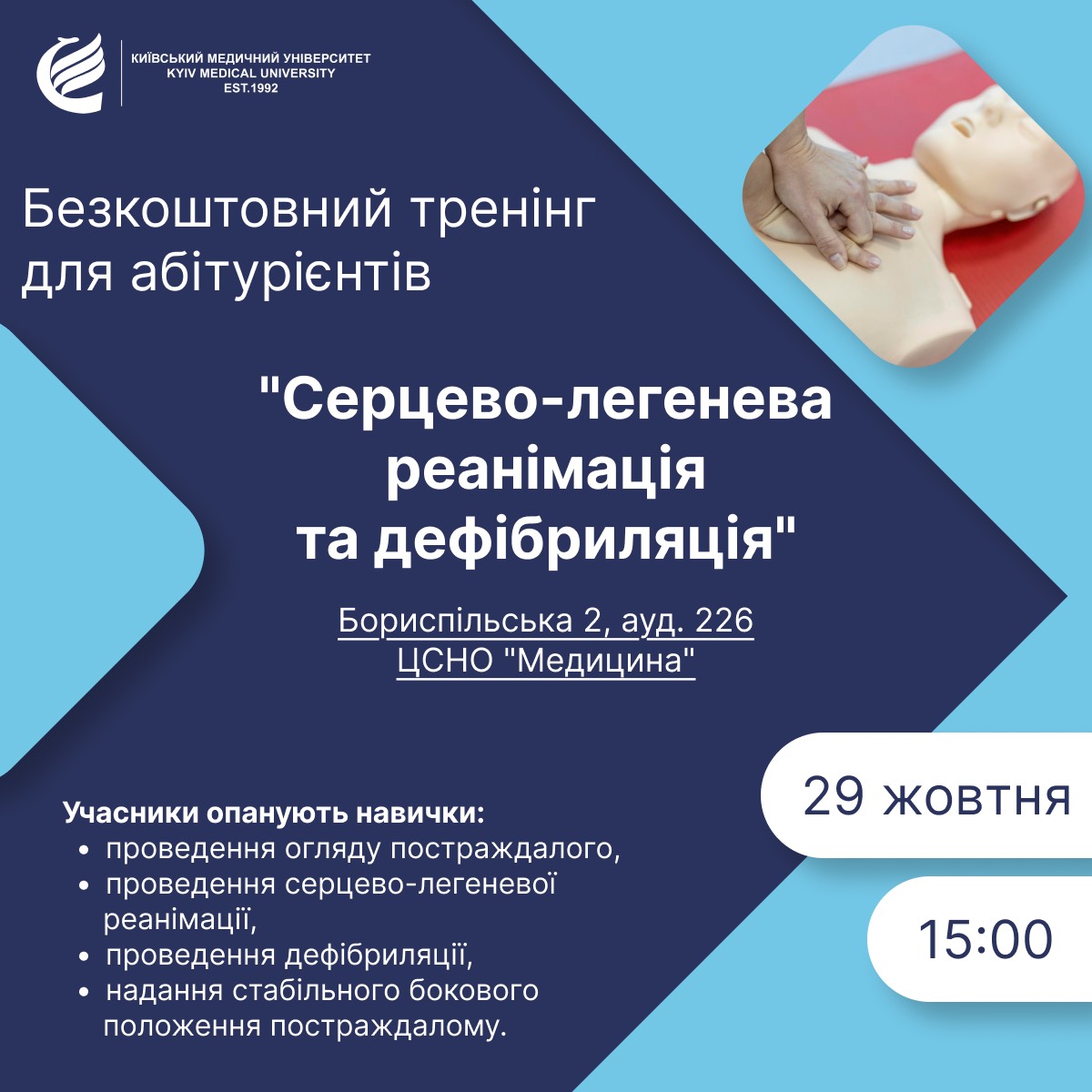 Безкоштовний тренінг для абітурієнтів «Серцево-легенева реанімація та дефібриляція»Шановні абітурієнти 2026 року! Ми продовжуємо чудову традицію безкоштовних тренінгів у Центрі симуляційного навчання та оцінювання «Медицина» для абітурієнтів – майбутніх медичних працівників! Це унікальна можливість відпрацювати практичні навички, які так важливі для сучасного медика — не з підручників, а в реальних умовах, максимально наближених до клінічної практики.