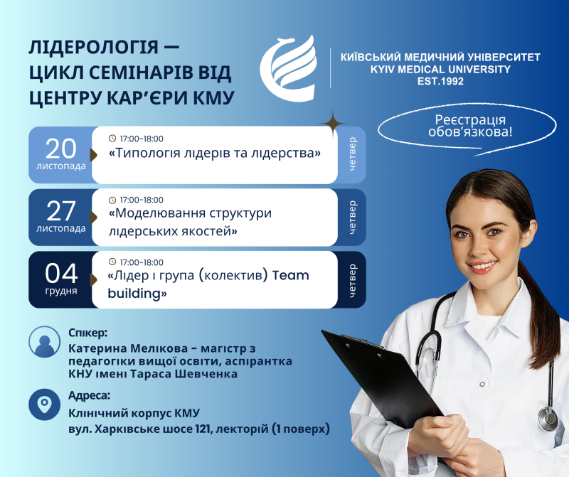 Центр кар’єри Київського Медичного Університету запрошує на новий цикл семінарів «Лідерологія»Відкрийте секрети ефективного лідерства на семінарах “Лідерологія” від Центру кар’єри Київського Медичного Університету. Запрошуємо всіх, хто прагне розвивати навички комунікації, самопрезентації та лідерства! Перший цикл: 20.11.2025 р., 27.11.2025 р., 04.12.2025 р. Теми: