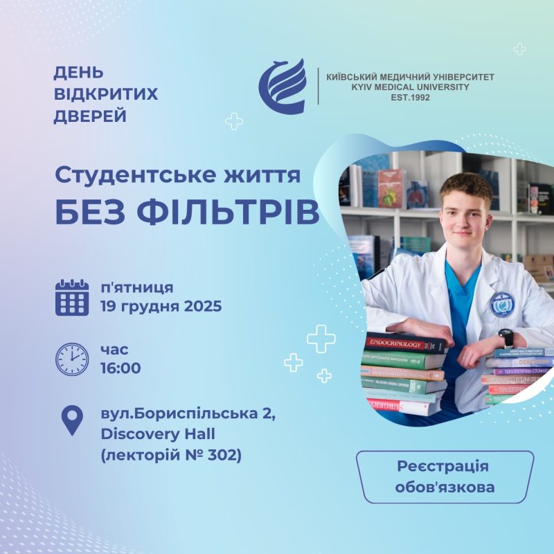 День відкритих дверей у Київському медичному університеті: студентське життя без прикрасКиївський медичний університет відкриває свої двері для всіх, хто хоче побачити студентське життя таким, яким воно є насправді. Як це – бути студентом медичного університету? Дата : 19 грудня 2025 Час: 16:00 Місце: Київський медичний університет, вул. Бориспільська, 2, Discovery Hall, (лекторій № 302) Що ви побачите на Дні відкритих дверей?