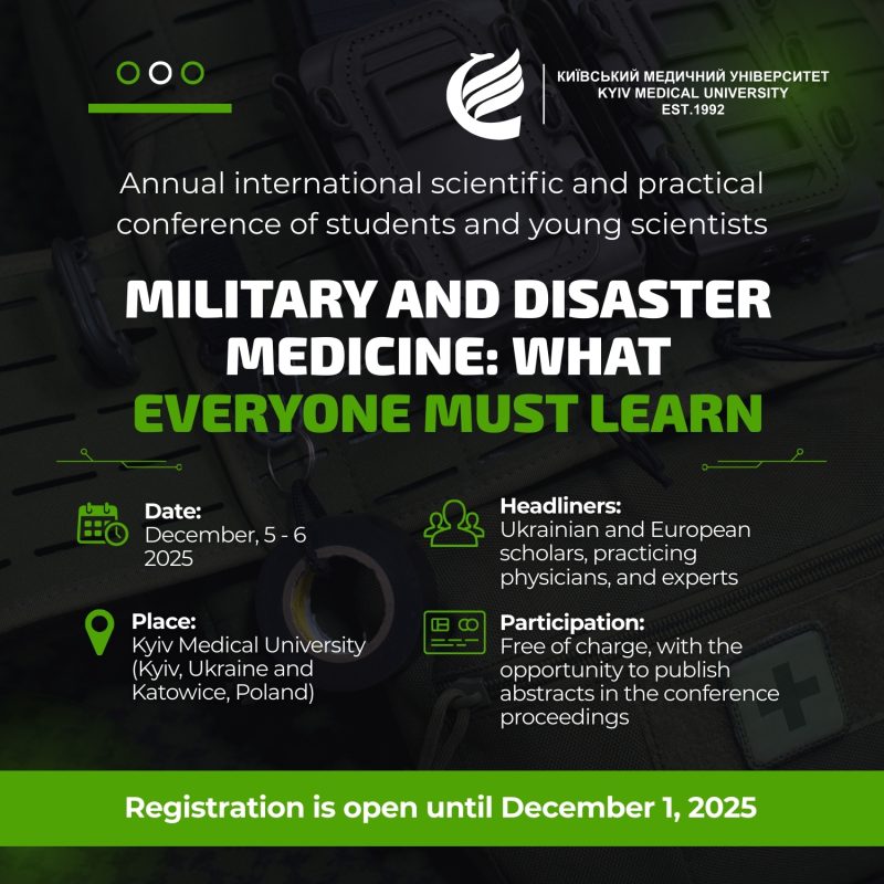 On December 5 – 6, 2025, we warmly invite you to take part in the annual international scientific and practical conference of students and young scientists «MILITARY AND DISASTER MEDICINE: WHAT EVERYONE MUST LEARN»