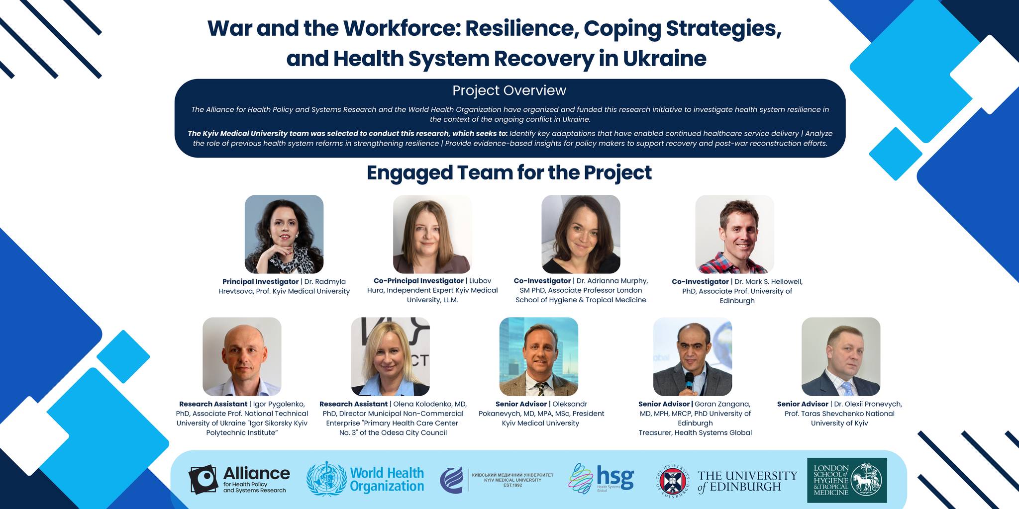 Дослідницький проєкт «Війна та людський потенціал охорони здоров’я: стійкість, стратегії подолання та відновлення в Україні» ПВНЗ «Київський медичний університет» є виконавцем дослідницького проєкту «Війна та людський потенціал системи охорони здоров’я: стійкість, стратегії подолання та відновлення в Україні» («War and the Workforce: Resilience, Coping Strategies, and Health System Recovery in Ukraine»), який підтримується і фінансується Всесвітньою організацією охорони здоров’я та Альянсом досліджень політик і системи охорони здоров’я. Проєкт виконується Київським медичним університетом (відповідальний дослідник – професор кафедри громадського здоров’я та мікробіології КМУ Радмила Гревцова) у співпраці з українськими та міжнародними партнерами – Health Systems Global, Лондонською школою гігієни та тропічної медицини та Університетом Единбурга (Велика Британія). Метою проєкту є з’ясування механізмів адаптації медичних працівників до роботи в умовах військової агресії російської федерації проти України та можливостей підтримки українських медиків. Результати дослідницького проєкту сприятимуть розробці ефективних стратегій відновлення кадрового потенціалу та зміцнення системи охорони здоров’я України. Проєкт підтримано Міністерством охорони здоров’я України (лист МОЗ України № 22-04/38890/2-25 від 15.12.2025 року). Термін реалізації проєкту 1 квітня 2025 – 31 липня 2026 року. 07.02.2024