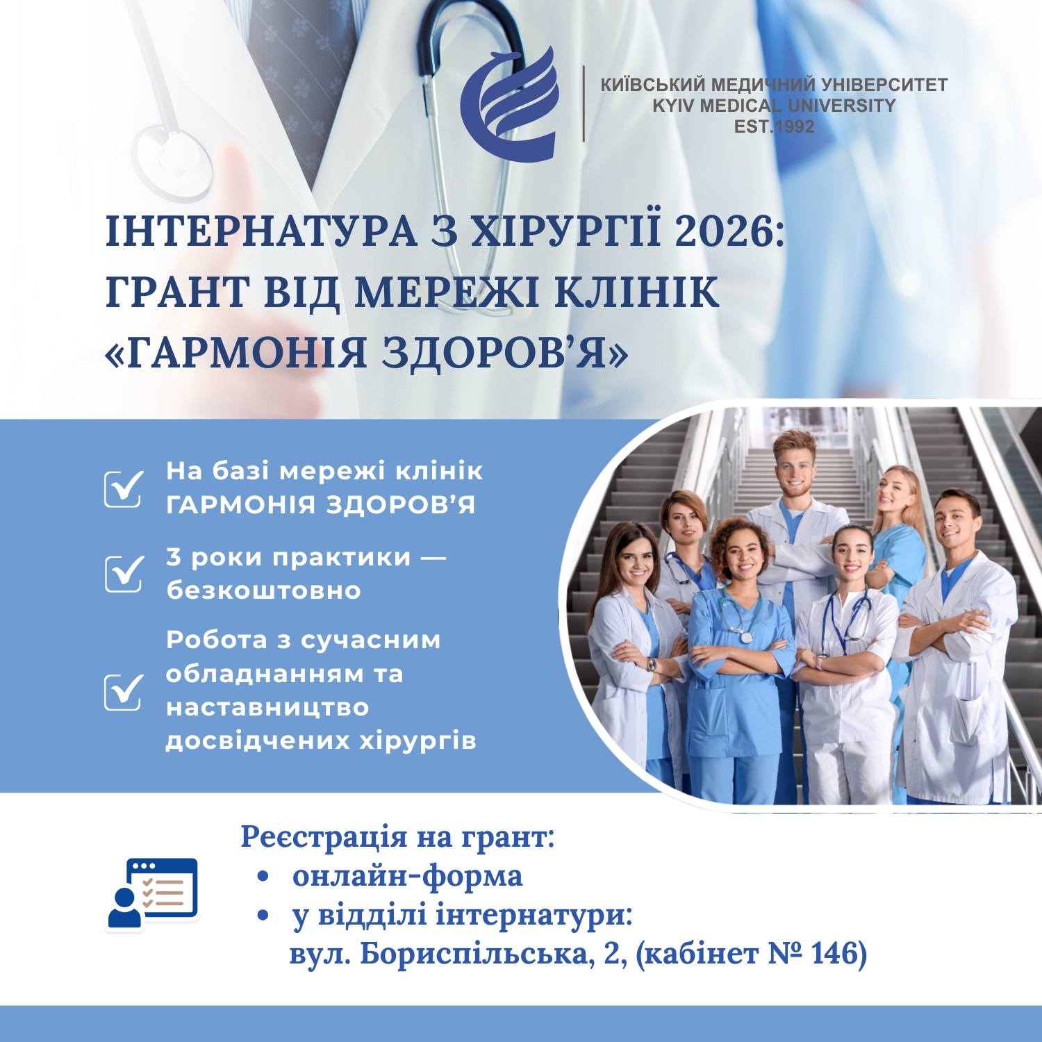 ГРАНТ на інтернатуру з хірургії 2026: безкоштовна практика у мережі клінік «Гармонія Здоровʼя»Партнер Київського медичного університету, мережа клінік «Гармонія Здоровʼя», пропонує вступникам до інтернатури 2026 року за спеціальністю “Хірургія” позмагатися за грант на навчання. Переможець конкурсу отримає унікальну можливість безкоштовно пройти практичну частину інтернатури протягом усього періоду навчання (3 роки) на базі мережі клінік «Гармонія Здоровʼя». Практична підготовка здійснюватиметься під керівництвом висококваліфікованих лікарів із використанням сучасних медичних технологій та ефективних методів хірургічного лікування. Обравши базою стажування мережу клінік «Гармонія Здоровʼя», лікарі-інтерни матимуть змогу: