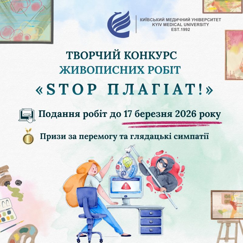 Київський медичний університет оголошує творчий конкурс живописних робіт «STOP ПЛАГІАТ!»До участі запрошуються студенти, які бажають проявити свої здібності з рисунку або живопису за тематикою протидії плагіатові. Мета конкурсу: підвищити мотивацію, стимулювати творчі здібності й уяву здобувачів вищої освіти з розвитку академічної культури та доброчесності. Тематика: пропонується обрати тематичний напрям з критики плагіату, за яким учасник створить власноручне графічне (колористично-графічне) зображення в обраній техніці певного жанру (див. техніки, жанри) про нечесне використання чужих текстів чи творів, винаходів; списування, фальсифікацію, фабрикацію, про самоплагіат або про зловживання технологією штучного інтелекту. Тематичним напрямом також можуть бути роботи присвячені пропагуванню чесного навчання. Техніки зображення. Для малюнку на папері формату А3 (297х420 мм) можна використати: