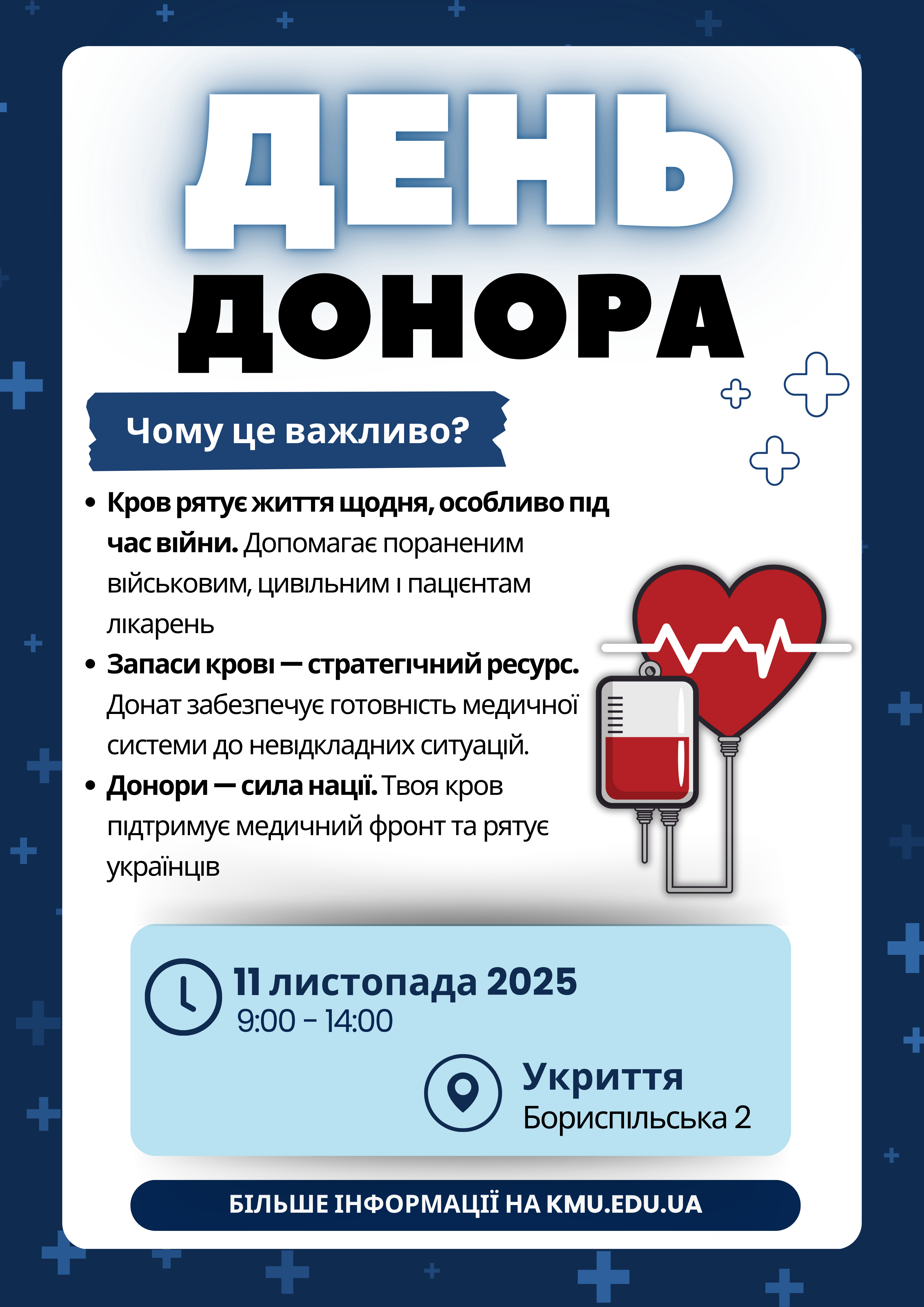 Київський Медичний Університет закликає: Долучайтеся до Дня донора 11 листопада 2025 року!В умовах повномасштабної агресії стале забезпечення донорською кров’ю та її компонентами є однією з ключових умов обороноздатності країни та запорукою національної безпеки. Кожна донація – це внесок у стійкість нашого фронту і тилу. В Україні триває важлива національна кампанія «Твоя кров може воювати. Стань донором». Зараз як ніколи важливо поповнювати запаси безпечної та якісної донорської крові. Вона життєво необхідна не лише для порятунку життів наших захисників та захисниць, але й для проведення планових і невідкладних операцій у тилу, прийому пологів, здійснення трансплантацій. Приєднуйтесь до життєво важливої ініціативи!Київський Медичний Університет традиційно підтримує цю важливу місію та запрошує студентів, інтернів, викладачів та співробітників долучитися до благородної справи донорства крові. Чекаємо на вас: