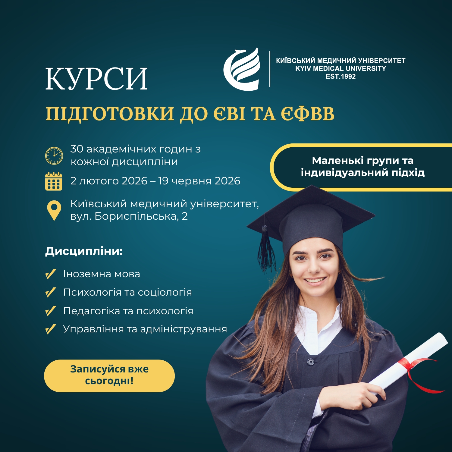 Курси підготовки до ЄВІ та ЄФВВ у Київському медичному університеті: шанс пройти вступ-2026 з упевненістю, а не зі страхомКиївський медичний університет запрошує всіх охочих на курси підготовки до вступу на магістерські програми 2026 року! Мета курсів: забезпечити якісну підготовку до складання Єдиного вступного іспиту (ЄВІ) та Єдиного фахового вступного випробування (ЄФВВ) для вступу на магістерські програми: