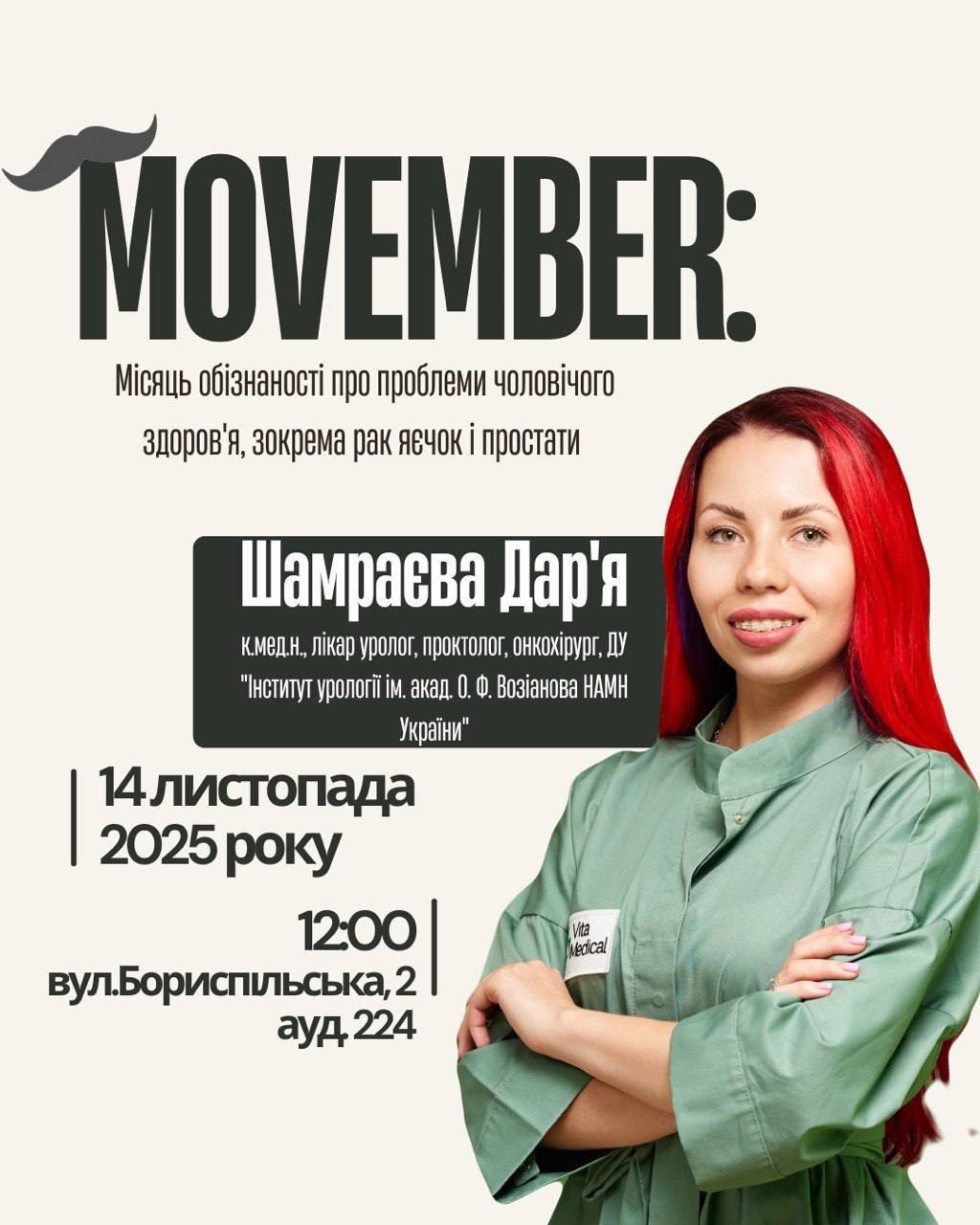 Movember — місяць чоловічого здоров’яЗапрошуємо студентів, інтернів та викладачів на відкриту лекцію 14 листопада 2025 року о 12:00 Листопад у всьому світі відомий як Movember — місяць, присвячений підвищенню обізнаності про проблеми чоловічого здоров’я, зокрема профілактику та раннє виявлення раку простати, яєчок та інших онкологічних захворювань. У межах ініціативи відбудеться тематична зустріч, присвячена профілактиці та сучасним підходам до діагностики й лікування захворювань у чоловіків. Спікер заходу — Шамраєва Дар’я, Подія покликана привернути увагу до важливості регулярних профілактичних оглядів і формування культури турботи про чоловіче здоров’я. Запрошуємо всіх охочих приєднатися до ініціативи Movember та відверто поговорити про чоловіче здоров’я.