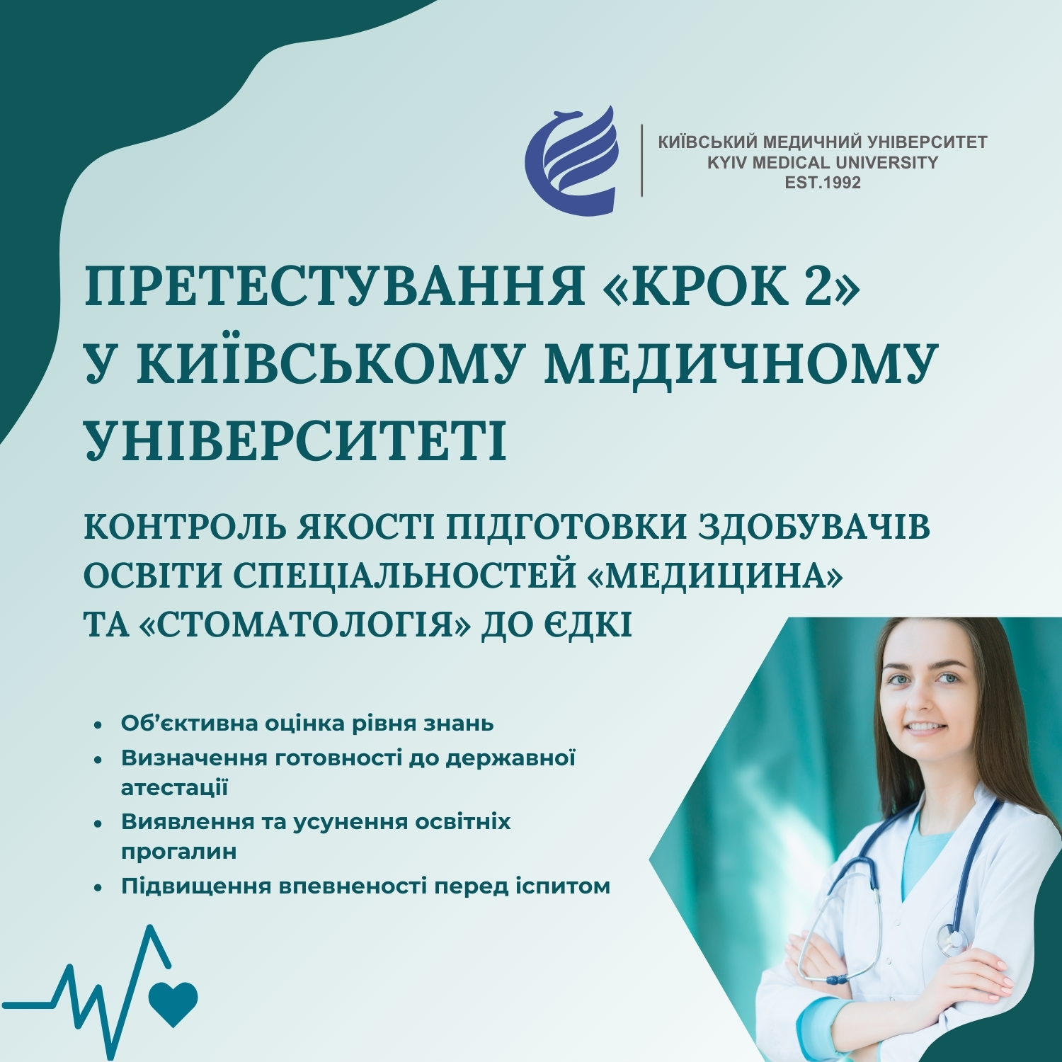 Претестування «КРОК 2» здобувачів освіти спеціальностей «Стоматологія» та «Медицина»: контроль якості підготовки здобувачів освіти до ЄДКІ у КМУУ Київському медичному університеті системна робота над якістю підготовки здобувачів освіти до ЄДКІ є невід’ємною частиною освітнього процесу. У межах Системи внутрішнього забезпечення якості освіти впроваджено постійний та всебічний контроль за рівнем підготовки студентів до атестації. Майбутні лікарі та стоматологи, крім традиційних іспитів, проходять один із найважливіших етапів професійної підготовки – Єдиний державний кваліфікаційний іспит (ЄДКІ). З метою об’єктивної оцінки рівня підготовки студентів Директорат з питань освіти системно організовує претестування у паперовому форматі та у форматі за допомогою інформаційно-комунікативних технологій. Це дає змогу: