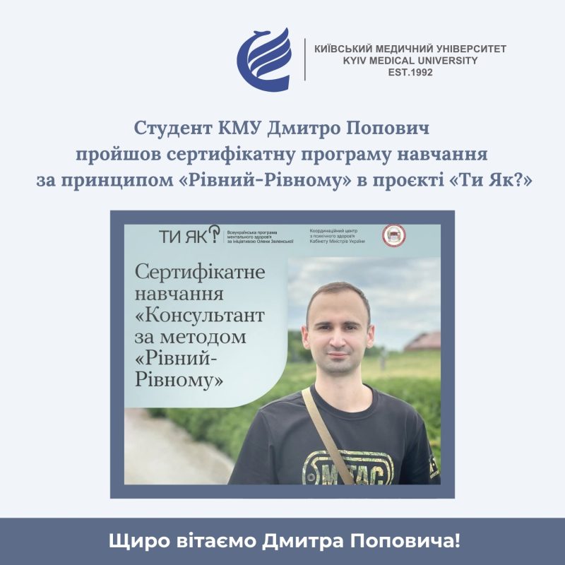 Студент КМУ Дмитро Попович пройшов сертифікатну програму навчання консультантів в проєкті «Ти Як?»Здобувач освіти на ОП «Клінічна психологія» Дмитро Попович – ветеран війни. Дмитро брав участь в обороні Маріуполя і згодом потрапив у полон. Саме там, у неволі, прийняв рішення: якщо вдасться стати учасником обміну та повернутися додому – обов’язково вивчиться на психолога. Обидва бажання здійснилися. Сьогодні Дмитро завершує другий рік навчання в Київському медичному університеті і пройшов сертифікатне навчання за принципом «Рівний-Рівному» в проєкті «Ти Як?». «Вперше про підтримку за принципом «Рівний-Рівному» я дізнався від психолога у своїй військовій частині. Мене це дуже зацікавило, адже зараз навчаюся на магістерській програмі з психології й планую розвиватися в цьому напрямку. І хотів долучитися саме до такого формату, бо щиро прагну працювати зі своїми побратимами – людьми, які мають схожий досвід», – розповідає ветеран. Нова навчальна програма «Рівний-Рівному» створена в межах Всеукраїнської програми ментального здоров’я Ти як? – ініціативи першої леді Олена Зеленська. Це унікальний стандарт, спрямований на підготовку фахівців, які в подальшому сприятимуть одужанню та відновленню благополуччя військовослужбовців. «Я переконаний, що цей формат може бути дуже ефективним як первинна ланка у спілкуванні з ветеранами. Ми, ветерани, маємо спільний досвід, а отже – проходимо ідентифікацію «свій – чужий» майже автоматично. Це створює довіру та відкриває шлях до подальшої допомоги, зокрема й від інших фахівців. У сучасних умовах, коли кількість ветеранів в Україні зростає, така модель роботи є вкрай необхідною», – упевнений Дмитро, який уже став учасником програми. Навчання консультантів за принципом «Рівний-Рівному» відбулось вперше в країні й було спрямоване на підготовку саме сертифікованих фахівців. Головними стейкхолдерами проєкту стали Координаційний центр КМУ / Mental Health UA, Мінветеранів, Київський національний університет імені Тараса Шевченка, зокрема Інститут психіатрії КНУ – курс проводився на базі закладу із залученням професорсько-викладацького складу та фахівців-експертів Координаційного центру. За сприяння Каліфорнійського університету Сан-Дієго (UC San Diego) та Міжнародного центру трансферу технологій в Україні ITTC Україна світовий досвід було адаптовано до сучасних потреб українців. «Мої враження від навчання дуже позитивні. Викладачі – висококваліфіковані фахівці, освітній процес триває у дружній атмосфері та, найголовніше, – з акцентом на практику. На кожному занятті нас дійсно активно залучають до практичної роботи. Я вже дізнався багато нового про комунікацію, різні підходи й методи в психології. Ці знання справді корисні, і я планую застосовувати їх у роботі зі своїми побратимами», – зазначив Дмитро Попович. Науково-педагогічний колектив та студенти Київського медичного університету висловлюють щиру повагу і вдячність Дмитру Поповичу за оборону України, його мужність і вибір психологічної професії. Бажаємо успіхів та стійкості в обраній сфері надання психологічної допомоги!