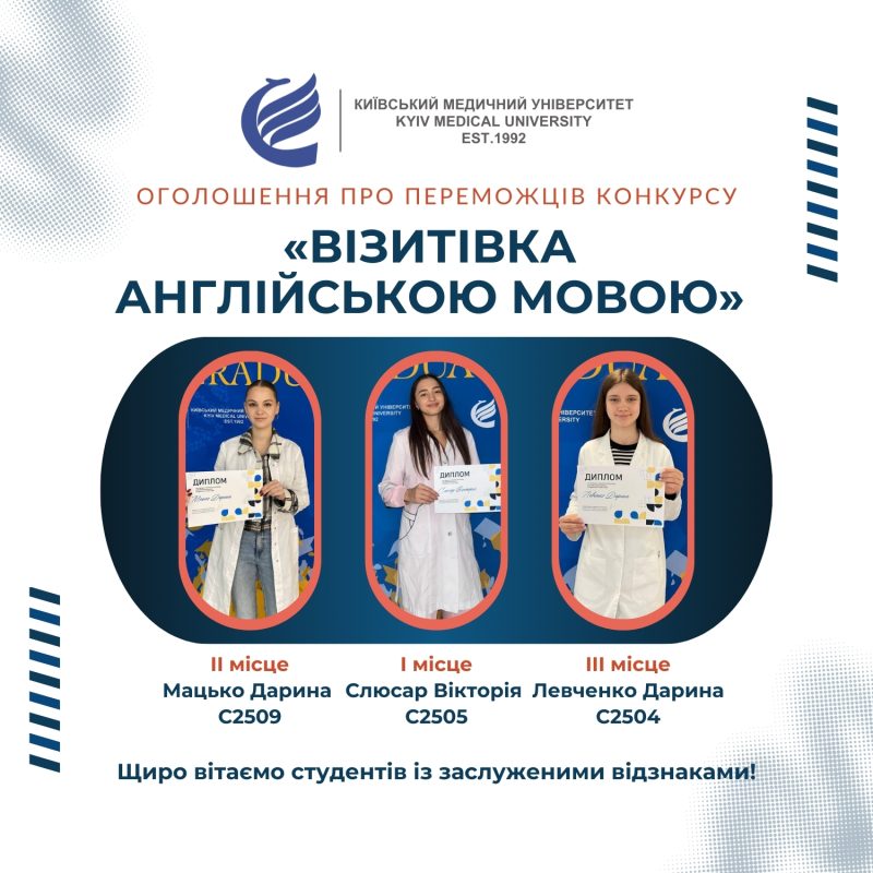 Студенти Київського медичного університету продемонстрували творчі навички у конкурсі англомовних візитівокУпродовж навчального семестру у межах вибіркового освітнього компонента «Ділова іноземна мова» студенти 1-го курсу стоматологічного факультету займались виконанням та презентацією візитівки англійською мовою. Під керівництвом завідувача кафедри соціально-гуманітарних дисциплін Світлани Зеленцової та викладача Юлії Сарданової студенти покращили навички та вміння у говорінні англійською мовою, а саме вміння висловити свої думки, використовуючи професійно-стоматологічну лексику, при цьому дотримуючись граматичних правил, комунікативні навички стосовно самопрезентації, покращили вимову та інтонацію, а також застосували творчий, креативний підхід в створенні візитівки англійською мовою з застосуванням мультимедійних програм та технологій. За результатами підсумкового оцінювання було визначено переможців конкурсу: Переможці були нагороджені почесними дипломами. Щиро вітаємо студентів із заслуженими відзнаками!