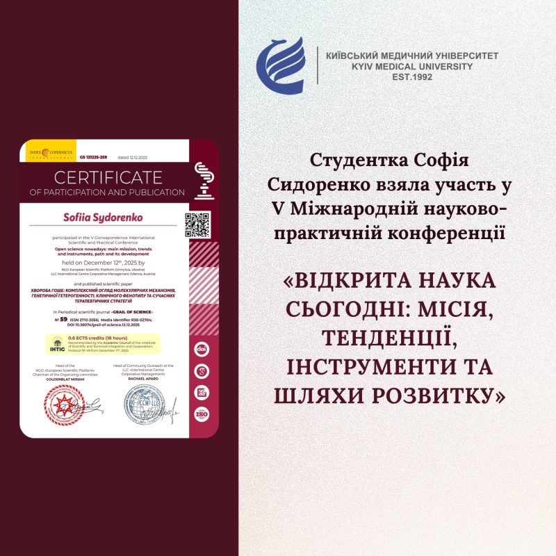 Студентка Софія Сидоренко взяла участь у V Міжнародній науково-практичній конференції «Відкрита наука сьогодні: місія, тенденції, інструменти та шляхи розвитку»12 грудня 2025 року студентка Київського медичного університету Софія Сидоренко долучилася до V Міжнародної науково-практичної конференції, яка проходила у форматі онлайн-сесії. У заході взяли участь як українські, так і зарубіжні науковці, що надало можливість студентам обмінятися знаннями та досвідом із колегами з різних країн. Наукова робота Софії була підготовлена під керівництвом науково-педагогічних працівників кафедри фізіології, медичної біології та біологічної фізики, дисципліни «Медична біологія». Тема дослідження, актуальна та науково значуща, демонструє високий рівень підготовки студентки та її здатність застосовувати сучасні методи дослідження в медичній біології. Участь студентів у міжнародних наукових заходах має низку важливих переваг: