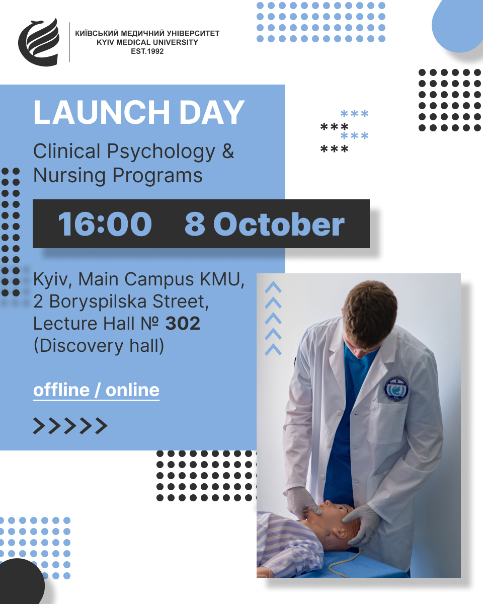 Студентський старт: інтеграційний захід для вступників на освітні програми «Клінічна психологія» та «Медсестринство»08 жовтня 2025 року у Київському медичному університеті відбудеться урочистий інтеграційний захід «Студентський старт: вступ до освітніх програм „Клінічна психологія“ та „Медсестринство“». Метою заходу є інтеграція нових студентів у академічне середовище університету, ознайомлення з особливостями освітніх програм, сприяння формуванню корпоративної культури та розвитку міжнародного партнерства, зокрема із Європейським банком реконструкції та розвитку та закордонними університетами. У програмі заходу передбачено вітальні слова керівництва університету, представників Міністерства охорони здоров’я України та міжнародних партнерів, виступи деканів, викладачів і студентів, а також міні – лекції та неформальне спілкування (нетворкінг).