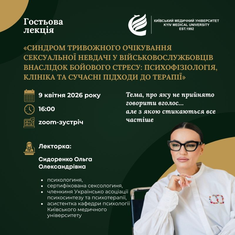Відкрита лекція Сидоренко Ольги Олександрівни на тему: «Синдром тривожного очікування сексуальної невдачі у військовослужбовців внаслідок бойового стресу: психофізіологія, клініка та сучасні підходи до терапії»Запрошуємо викладачів, інтернів, студентів та абітурієнтів на відкриту лекцію психологині та сертифікованої сексологині Сидоренко Ольги Олександрівни. Про лекторку: Чому ця лекція є важливою: Учасники лекції отримають відповіді на ключові питання: