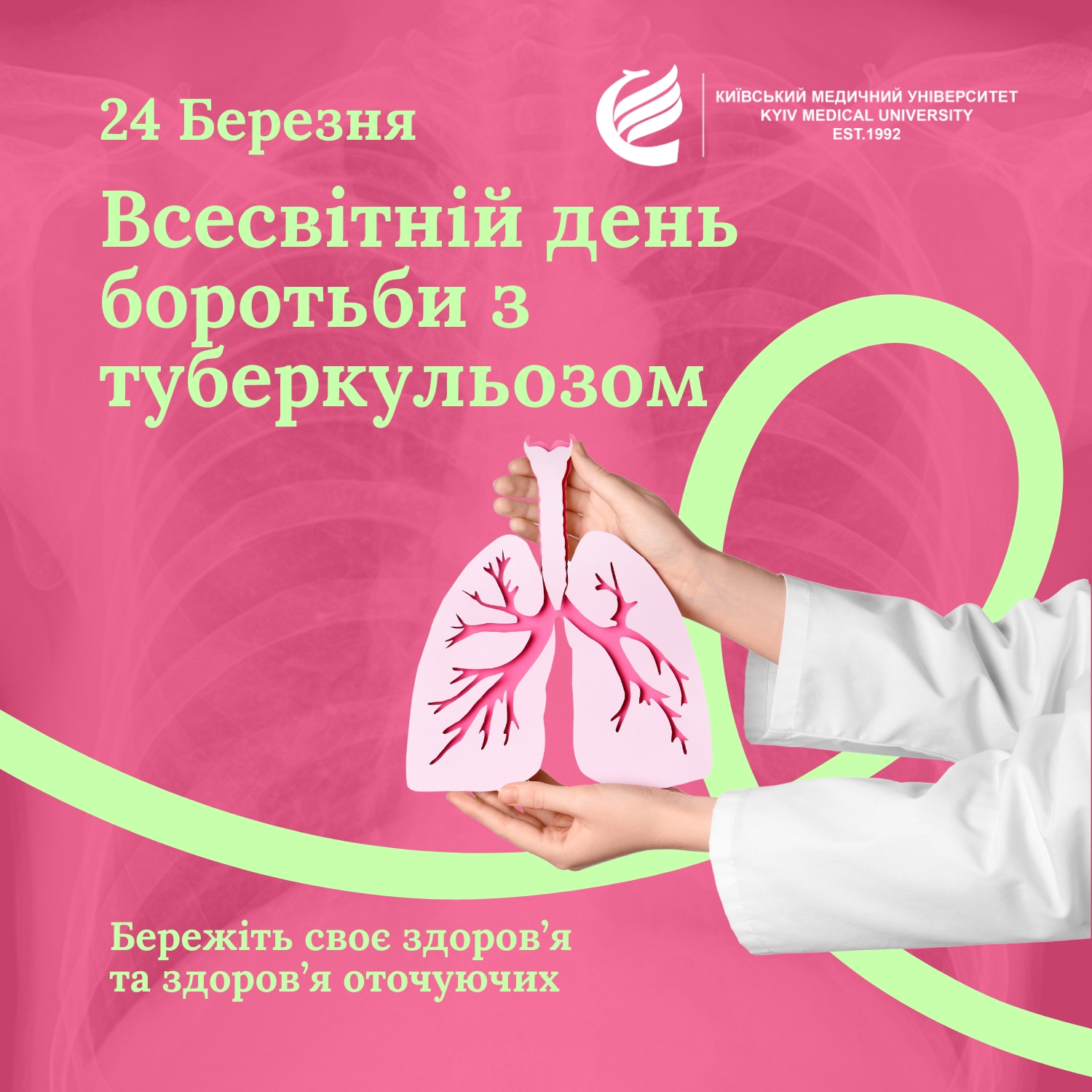 24 березня — Всесвітній день боротьби з туберкульозомЦей день був запроваджений Всесвітньою організацією охорони здоров’я з метою підвищення обізнаності про туберкульоз — небезпечне інфекційне захворювання, яке й досі залишається серйозною загрозою для здоров’я людей у всьому світі. Туберкульоз найчастіше вражає легені та передається повітряно-крапельним шляхом. Вчасна діагностика, правильне лікування та відповідальне ставлення до власного здоров’я є ключовими факторами у боротьбі з цією хворобою. Сучасна медицина має ефективні методи лікування туберкульозу, однак важливо пам’ятати: раннє виявлення значно підвищує шанси на повне одужання. Київський медичний університет підтримує глобальні ініціативи у боротьбі з туберкульозом та наголошує на важливості профілактики, регулярних обстежень і підвищення рівня обізнаності населення. Бережіть своє здоров’я та здоров’я оточуючих.