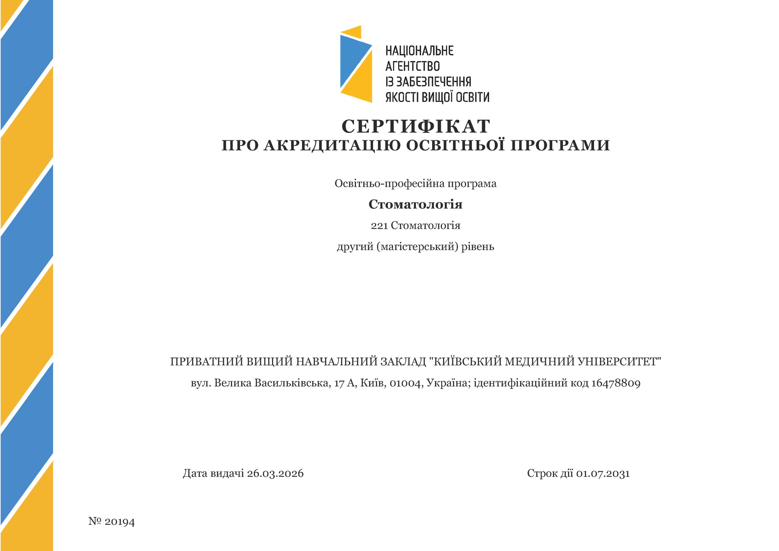 ВІДОМОСТІ ПРО САМООЦІНЮВАННЯ ОСВІТНЬО-ПРОФЕСІЙНОЇ ПРОГРАМИ "СТОМАТОЛОГІЯ"