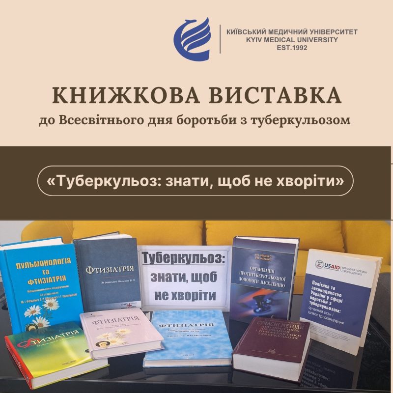 Книжкова виставка до Всесвітнього дня боротьби з туберкульозом «Туберкульоз: знати, щоб не хворіти»З метою підвищення обізнаності користувачів про небезпечне інфекційне захворювання та способи його профілактики у бібліотеці Київського медичного університету оформлено книжкову виставку «Туберкульоз: знати, щоб не хворіти». Експозиція знайомить відвідувачів із науково-популярною, медичною та довідковою літературою, яка розкриває сутність туберкульозу, шляхи його передачі, основні симптоми та сучасні методи лікування. Окрему увагу приділено виданням, що висвітлюють питання профілактики захворювання, значення своєчасної діагностики та ведення здорового способу життя. На виставці представлені: