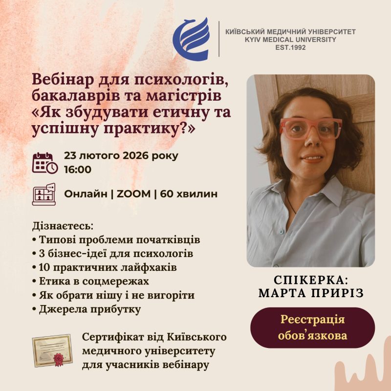 Дата: 23 лютого 2026 року Реєструйтеся за посиланням. Учасники лекції отримають електронний сертифікат від Київського медичного університету та можливість дізнатись більше про освітні програми з психології! Долучайтеся до вебінару та зробіть упевнений крок до створення етичної й успішної приватної практики! Чекаємо на вас!