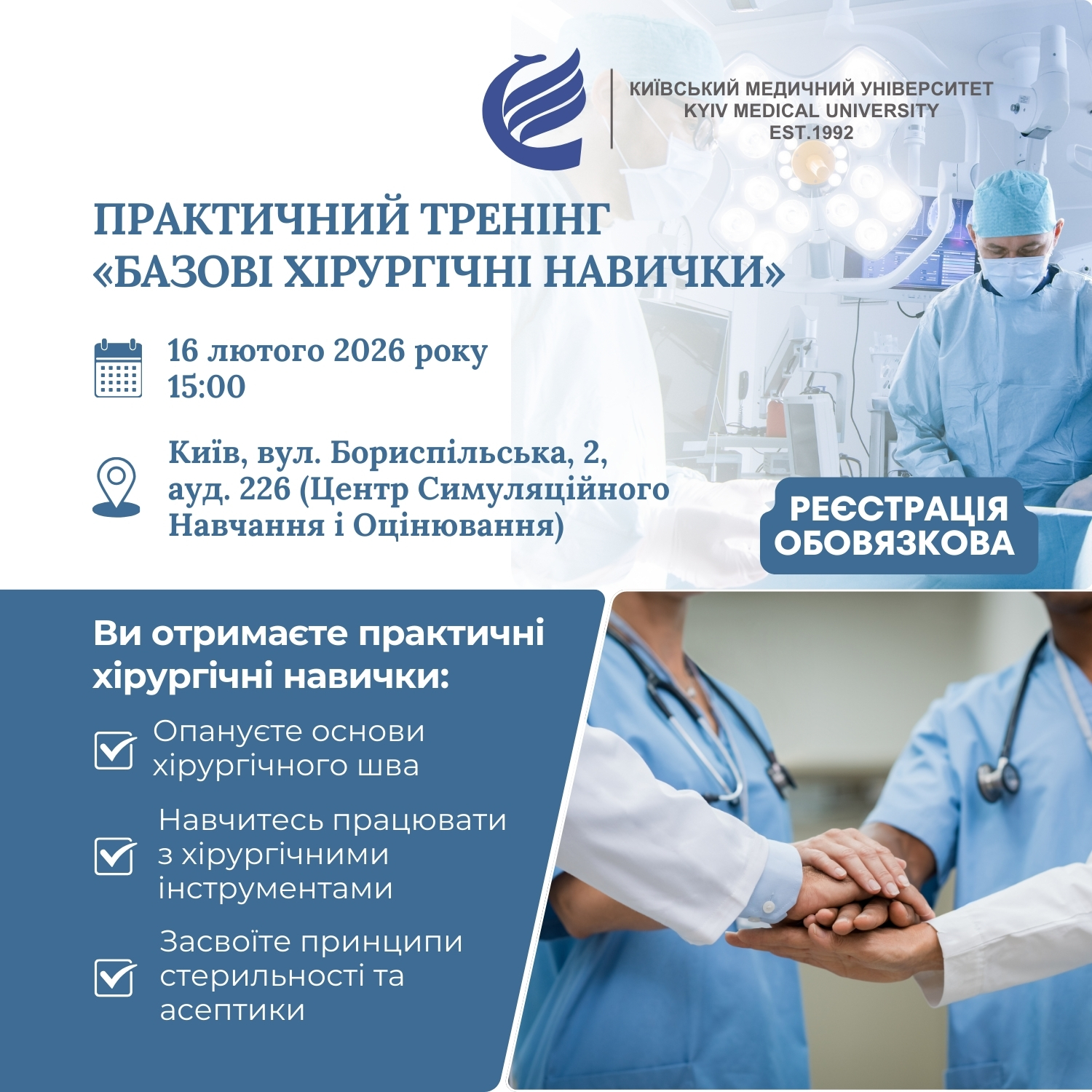 Цей інтенсив створений для тих, хто хоче перевірити свою точність рухів, концентрацію та готовність до відповідальності. Саме так формується усвідомлений вибір майбутньої спеціальності. Дата та час: 16 лютого 2026 року Місце проведення: м. Київ, вул. Бориспільська, 2, аудиторія № 226, Центр Симуляційного Навчання та Оцінювання Участь: безкоштовна Реєструйтеся за посиланням. Кількість місць обмежена, адже формат тренінгу передбачає індивідуальну практичну роботу кожного учасника. Не відкладайте рішення, яке може визначити вашу професійну траєкторію. Ми будемо раді зустріти вас на тренінгу та допомогти зробити перший крок у світ хірургії!