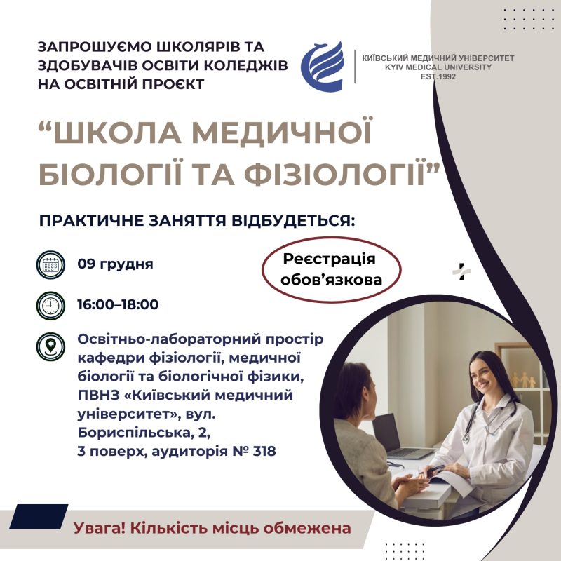 Відкриваємо світ медичної біології та фізіології: освітній простір для учнів та студентівЗапрошуємо школярів та здобувачів освіти коледжів на освітній проєкт “Школа медичної біології та фізіології”. Цікавишся медициною, біологією, фізіологією людини й хочеш відчути себе студентом-науковцем? Кафедра фізіології, медичної біології та біологічної фізики (ПВНЗ «Київський медичний університет») відкриває свої двері для учнів 8–11 класів та здобувачів освіти коледжів, які прагнуть дізнатися більше про медичну біологію, фізіологію людини та ознайомитися з роботою освітнього простору. Що на тебе чекає? Наше практичне заняття відбудеться: Час проведення заняття: Місце проведення: Увага! Кількість місць обмежена. Маєте запитання? Приймальна комісія КМУ: