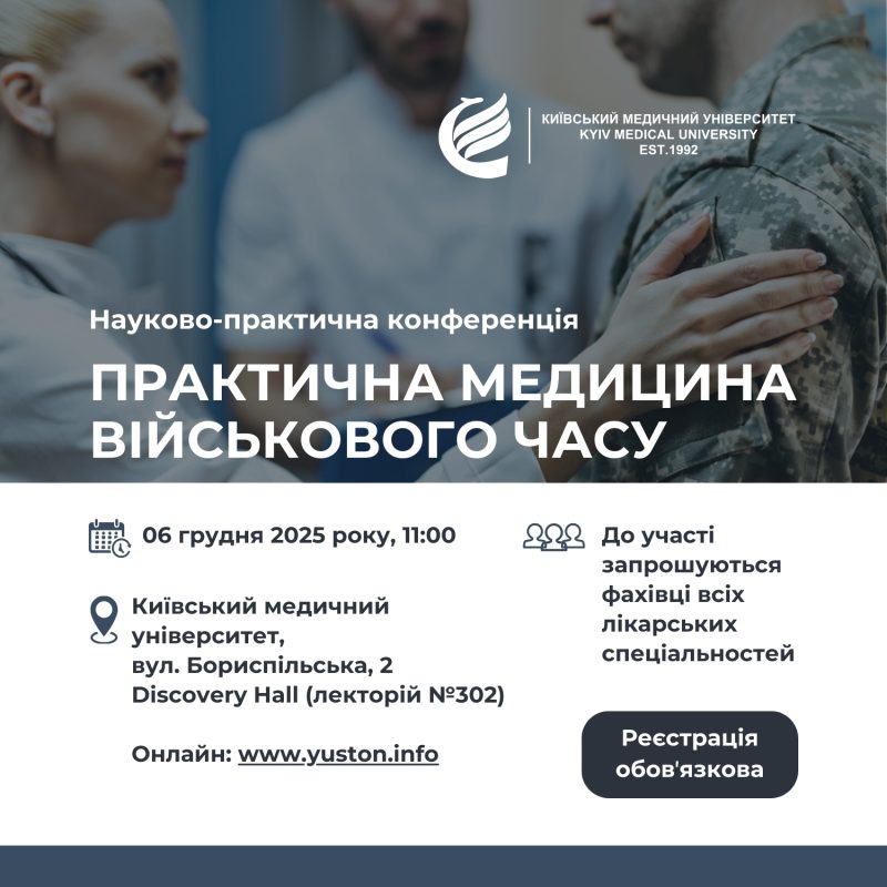 Науково-практична конференція: «Практична медицина військового часу»Вельмишановні колеги! ПВНЗ «Київський медичний університет» як співорганізатор запрошує фахівців до участі в науково-практичній конференції «Практична медицина військового часу». Дата: 06 грудня 2025 року Захід відбудеться за адресою: Для зручності учасників передбачена онлайн-трансляція Початок: 11:00 Спеціалізації: Модераторки:
