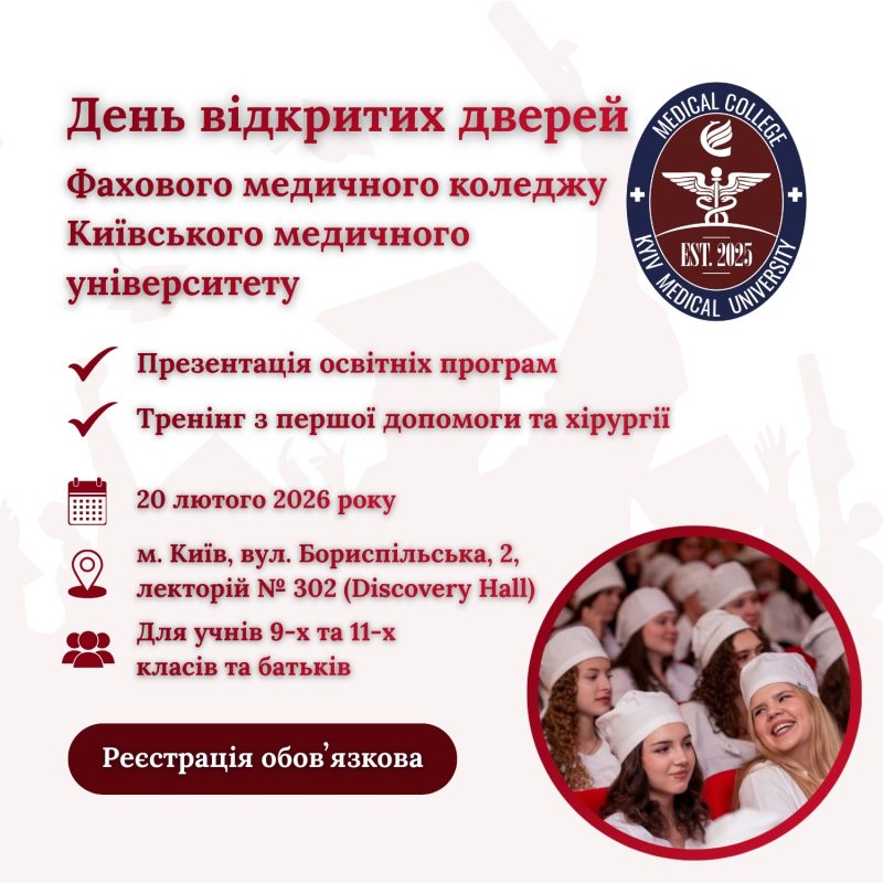 Запрошуємо абітурієнтів на практичний День відкритих дверей у Фаховому медичному коледжіФаховий медичний коледж, структурний підрозділ Київського медичного університету, запрошує учнів 9-х та 11-х класів та їхніх батьків на День відкритих дверей в очному форматі. Дата: 20 лютого 2026 року Освітні програми: